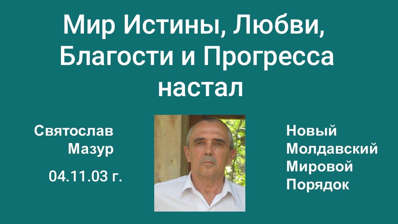 Вчера, 3 ноября 03 года по новому летоисчислению, я, Святослав Мазур, Великий Магистр, по плану Бога Отца Вседержителя перевёл планету Земля под свой полный контроль и водительство. Теперь на ближайшие тысячу лет все процессы, происходящие на Земле, будут подчиняться моей святой воле. Никакие иные силы не смогут влиять на ход вещей, которые будут происходить и на Земле, и с планетой в целом. Поэтому сегодня я однозначно могу сказать, что мир Истины, Любви, Благости и Прогресса настал.