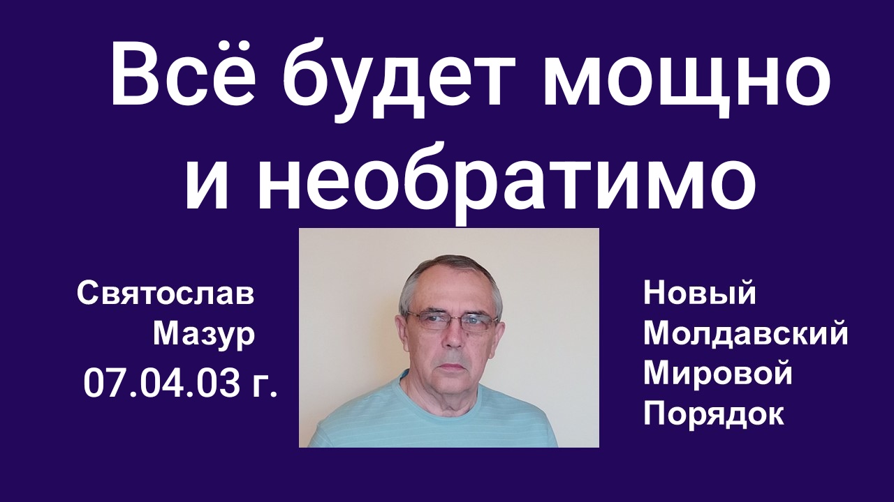 Сейчас, когда мир Истины наступил, а я, Святослав Мазур, Великий Магистр, встал во главе Нового Молдавского Мирового Порядка, только краткий миг времени нас отделяет от главных событий на планете, от перехода всего человечества на свой новый духовный уровень развития. Он произойдёт резко и одномоментно в 12:00 по молдавскому времени 20 апреля.