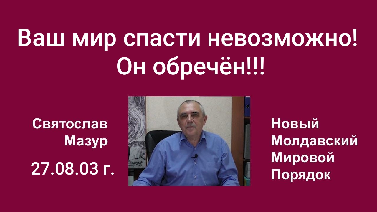 Итак, я, Святослав Мазур, согласно плану Бога Отца Вседержителя, запустил строительство Нового Молдавского Мирового Порядка, которое остановить невозможно. Он обязательно будет построен, ибо его строят мои Божественные иерархи. И напротив, мир, в котором вы все живёте, обречён на гибель. И в помощь этому миру для его самоликвидации даны четыре всадника апокалипсиса. Уйти от них никому не суждено, ибо все, кто избрал мир дьявола, вместе с ним и погибнет. Как говорится, что посеешь, то пожнёшь.