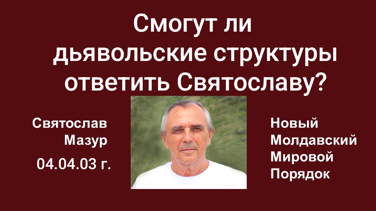 Я, Святослав Мазур, Великий Магистр, Иисус Христос второго пришествия, на завтра подготовил важнейшую акцию. Вселенская Душа завтра в 12:00 по молдавскому времени включит часы истории, которые 20 апреля 03 года по новому летоисчислению заранее в 12:00 обнулятся и начнут отсчитывать новую историю всего человечества от нуля часов до тысячи лет. Это космическое действие сделает невозможным захват власти на планете дьявольскими структурами, которые, конечно, в течение этих двух недель не смогут дать ответ на космические вопросы и тем более не смогут дать ответ моей космической реальности.