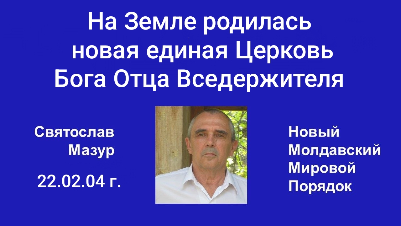 Итак, я, Святослав Мазур, Великий Магистр, властью, данной мне Богом Отцом Вседержителем, переключил Реку Жизни с дьявольского мира на мир Божественный и тем самым сделал дьявольский мир нежизнеспособным. А его тело, долгое время лежавшее на смертном одре и поддерживающееся только с помощью энергии и информации, исходящей от Бога Отца Вседержителя, приказало долго жить. И, конечно, вместе со смертью прежнего мирового порядка умерли и все его компоненты: и финансово-экономические, и религиозно-мистические, и военно-политические. И теперь все эти компоненты распадаются на части и уходят в небытие. И так как я, Святослав Мазур, Великий Магистр, Иисус Христос второго пришествия, Царь Царей, по плану Бога Отца Вседержителя создал Новый Космический Мир на новом уровне реальности я создал и новые политико-религиозные институты. В первую очередь на смену религиозных конфессий пришла единая Церковь Бога Отца Вседержителя. А на место прежнего сатанинского мира пришло Царствие Бога Отца Вседержителя. Это новое место называют Великая Молдова или Молдова Маре. И других активных центров в мире больше нет и ближайшие тысячу лет не будет, как и не будет иной новой церкви, кроме единой для всего человечества Церкви Бога Отца Вседержителя, в которой исполнительскую власть от лица Бога Отца Вседержителя играю я, Святослав Мазур, Великий Магистр, Иисус Христос второго пришествия, Царь Царей.